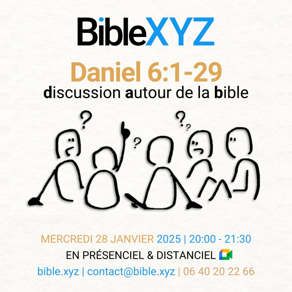 dans le labyrinthe de la vie. BibleXYZ veut rendre la BibleAccessible (B.A.BA) aux IllustresInconnus (XYZ) d’aujourd’hui, avec créativité et pertinence. Découvrez nos publications sur les pages B.A.BA et XYZ. Notre cœur d’activité sont les discussions autour de la bible (d.a.b), en présenciel et en distanciel, les mercredis soirs à 20h00
