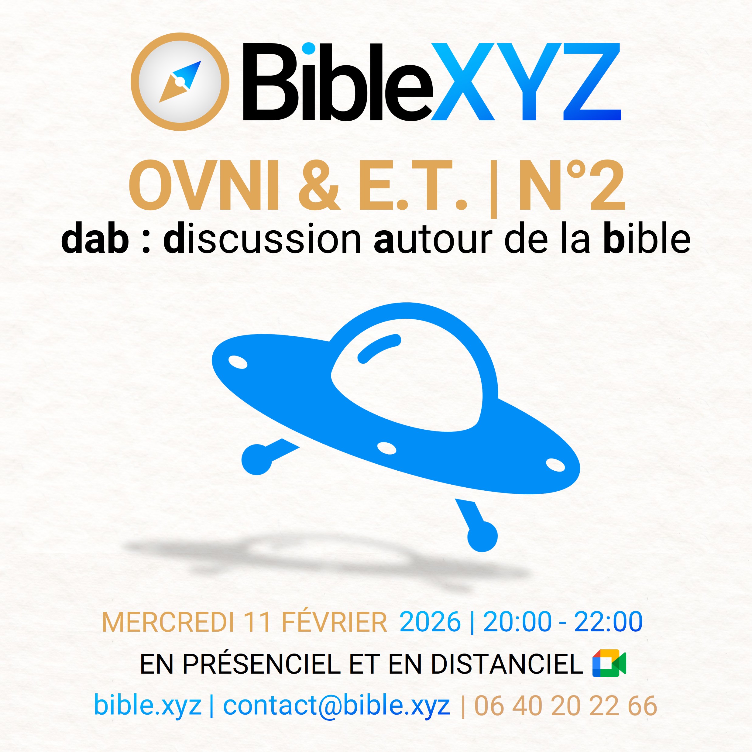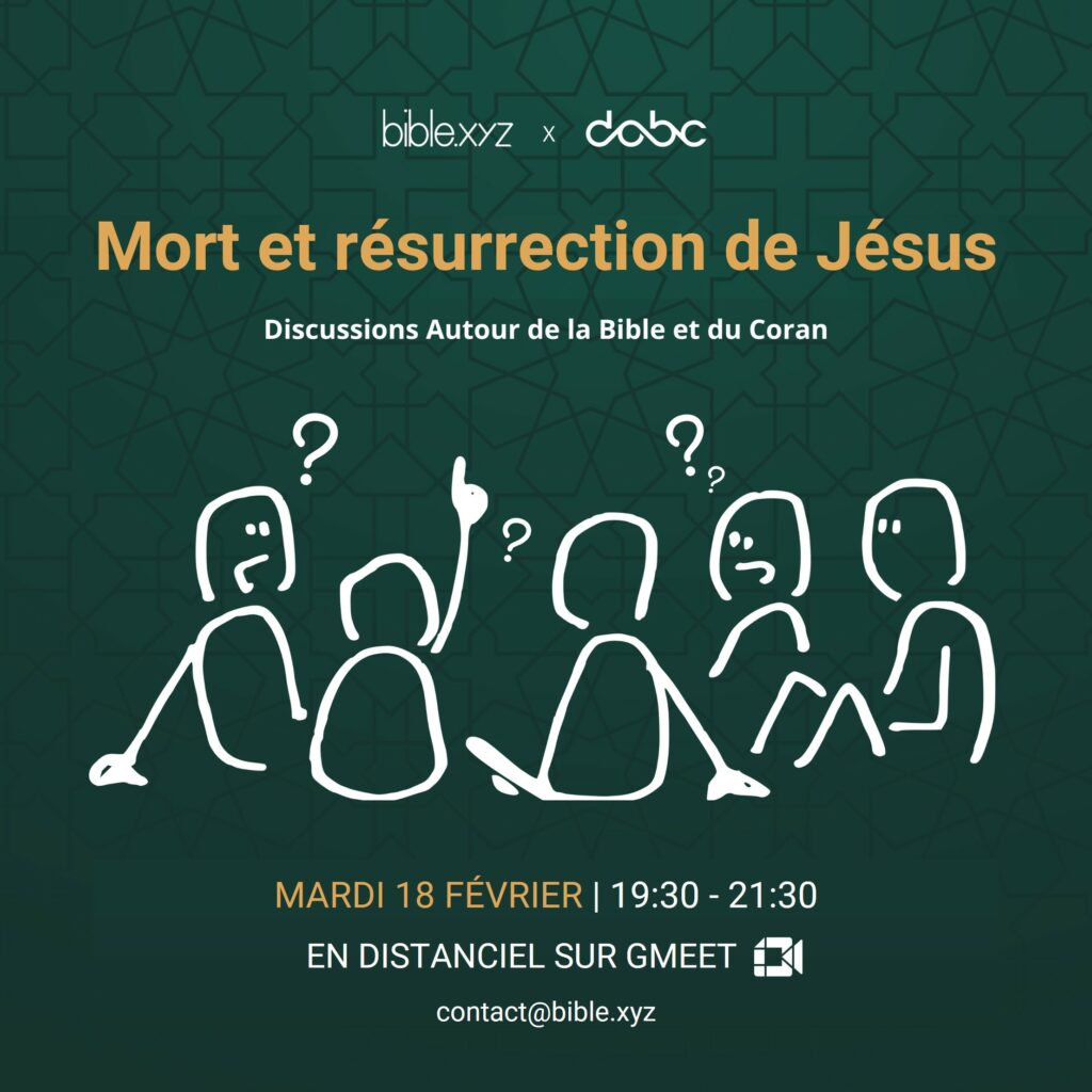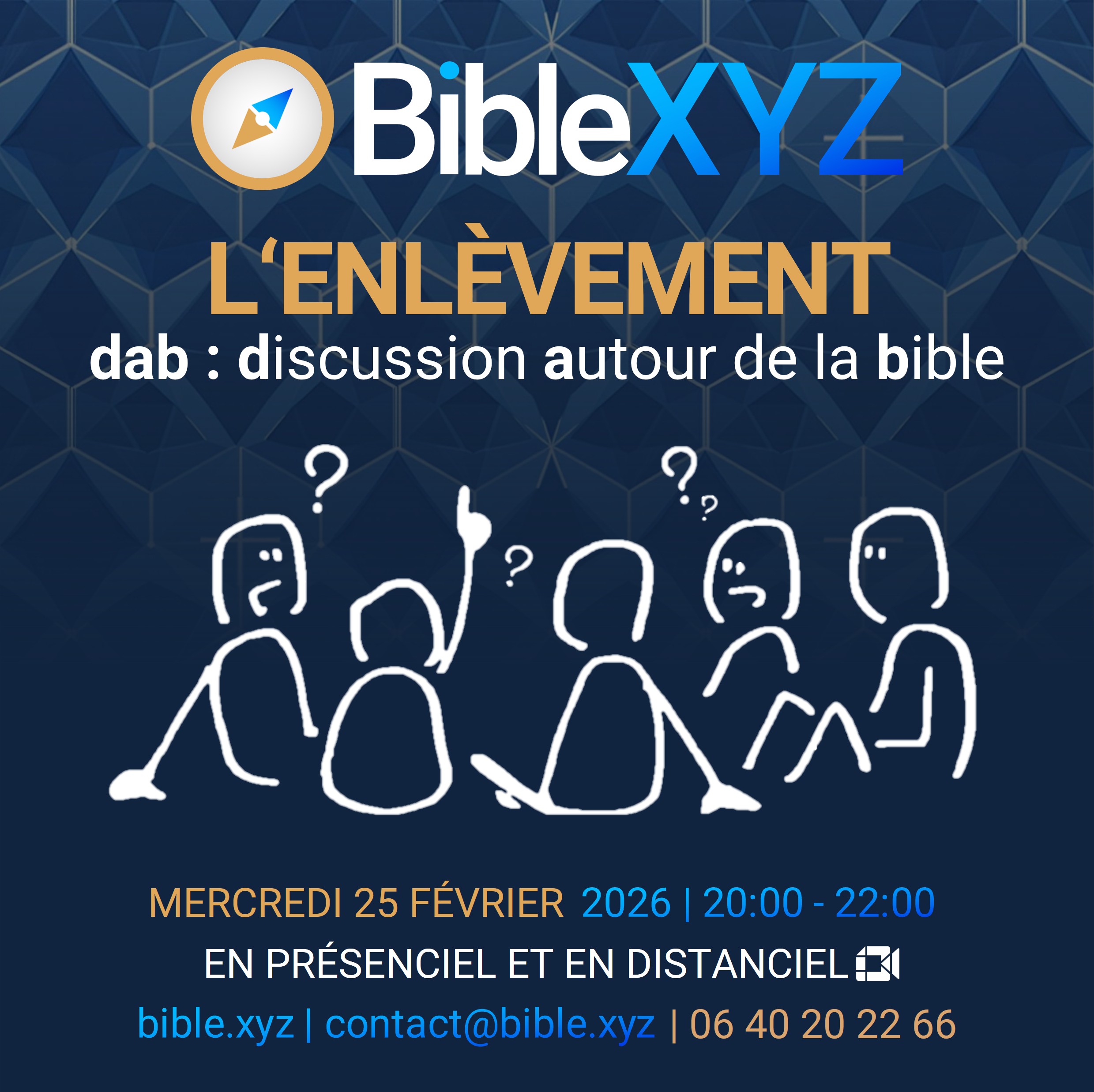 Notre cœur d’activité sont les discussions autour de la bible (d.a.b), en présenciel et en distanciel, les mercredis soirs à 20h00 . Dynamiques et conviviaux, ces temps d’échange en petit groupe adoptent différentes formes (discussions, vidéo-débats, brainstorming…) et abordent, notamment, d’autres thèmes en lien avec la bible (philosophie, métaphysique, actualité…). Ajoutez ces réunions à votre agenda ci-dessous